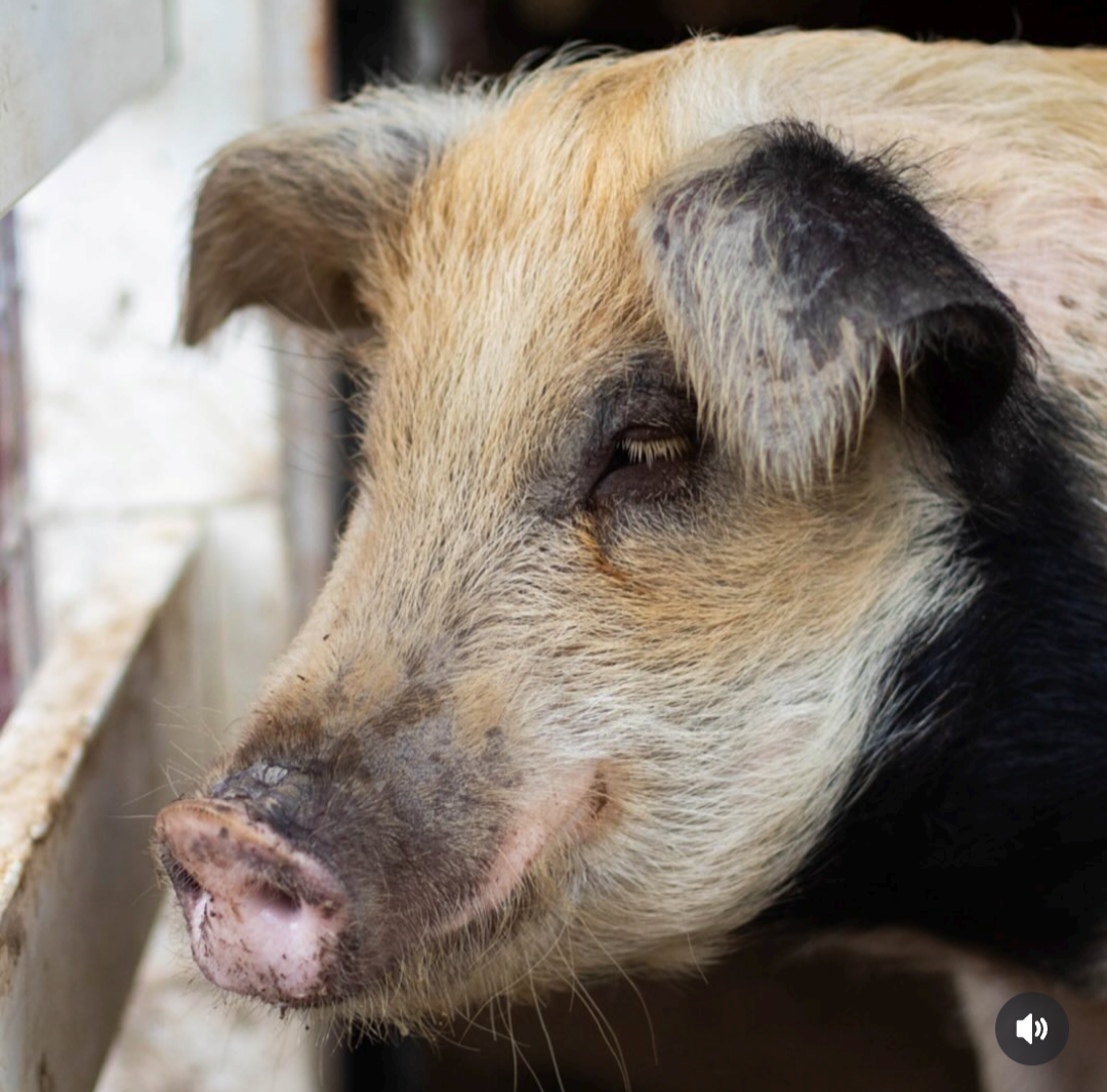 Lily came to the farm after being kicked out of her house for not “behaving” well. Piggies are very food motivated. She was living in a house with food and a small child, and it was too hard to have boundaries with non-pig-educated owners. She is the QUEEN at MMFS, and loved by so many. She loves her routine, snuggles with her kitties, and somewhat tolerates the new pig friends! She is a middle-aged piggy with some arthritis and has some difficult skin. We are working on her pain management for her mobility and constantly working on her skin.