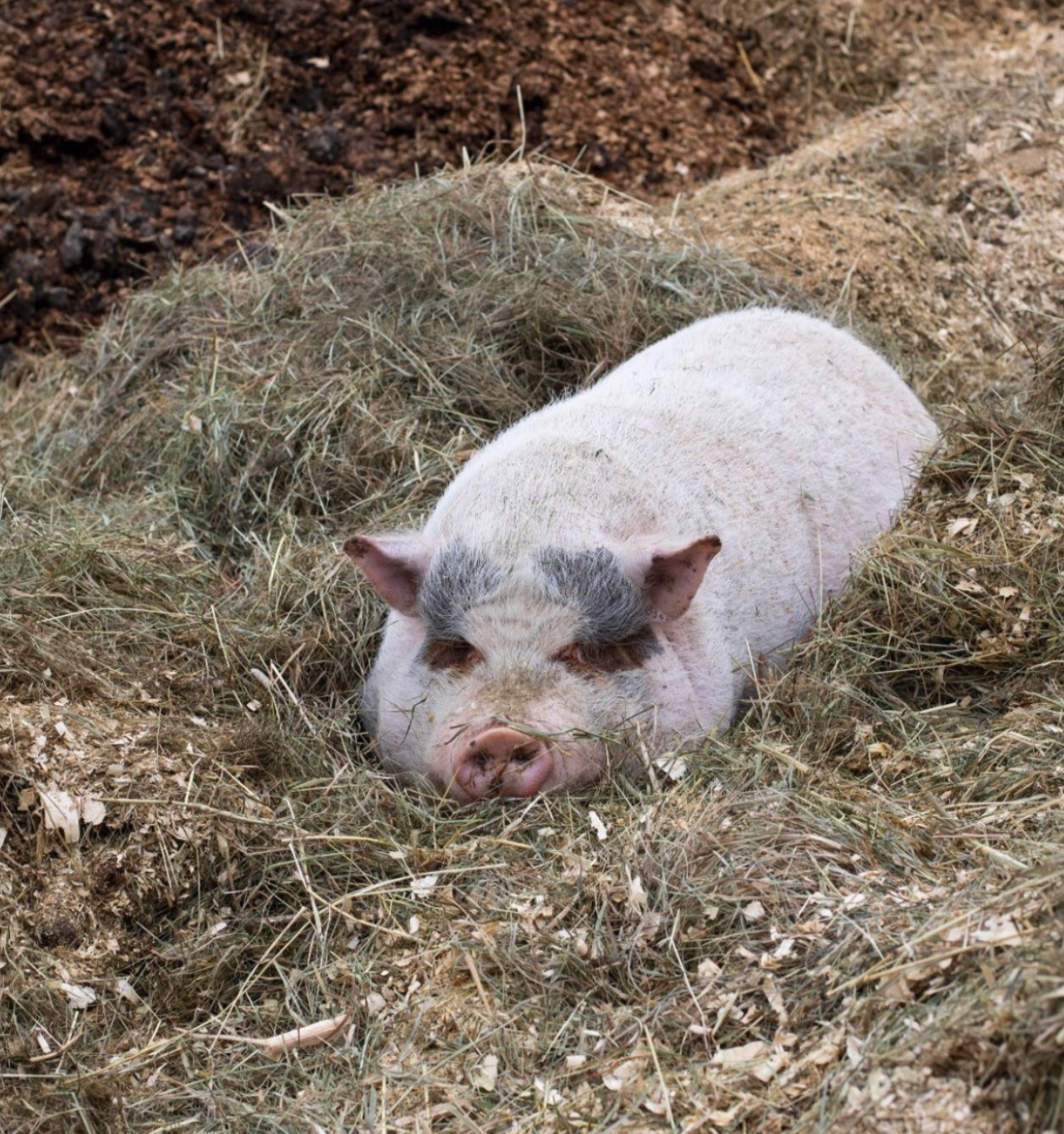 Walter is a young farm pig who showed up in the backyard of a homeowner in central Vermont. With no one looking for him, we can only guess about his history - Did he fall off a transport truck? Did he run away from a local farm? We will never know, but he is safe with us. He is a calm boy who seems unfazed by the busyness of the barn. He loves blueberries and laying in his comfy hay for a good nap.